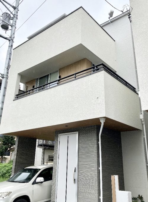 近未来的な印象のクールなデザイナーズハウスです。オフホワイトにグレイと、無彩色がベースになっていて、部分的にウッディーな木目調サイディングが使われていてお洒落です。