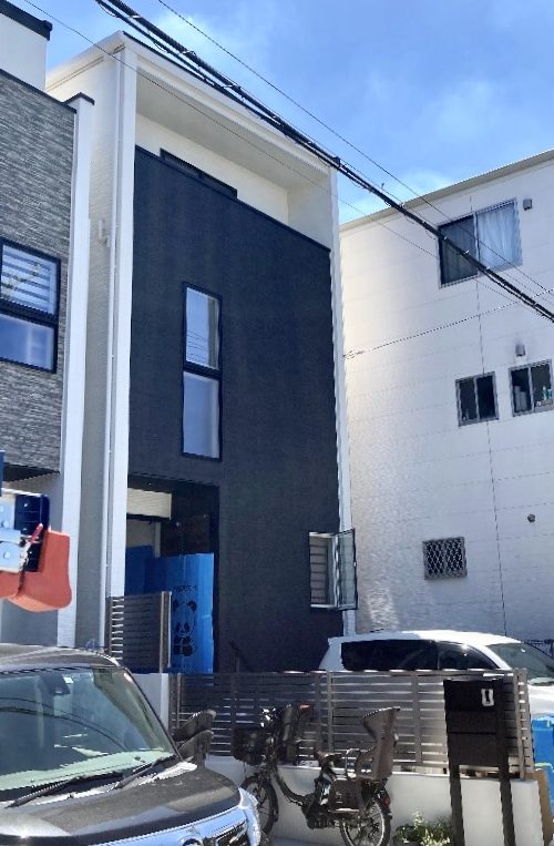 お家の前面が濃いグレイ、側面と背面が真っ白という、コントラストも鮮やかな三階建てのお家です。すっきりしたスマートなフォルムも都会的で垢抜けています。