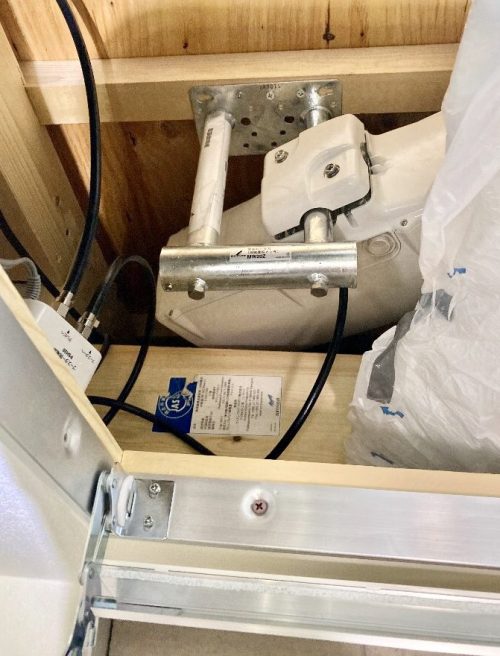 ただ、かなり緩やかな勾配の片流れ屋根になっていますので、スペースが狭く、縦長の通常のデザインアンテナは入りません。そこで横型デザインアンテナを持ち込んでみました。ギリギリ入った感じですが、これなら屋内設置可能です。お客さまのご希望どおり、三階点検口の中に横型デザインアンテナ設置を行いました。ブースター用電源も設えられていましたので、こちらでブースターへの電気供給を行いました。