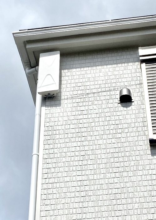 お客さまにその旨お話しし、ご了解をいただきましたので工事に進みます。軒天の下の二階壁面の角に、デザインアンテナ設置を行いました。壁面に小さな穴を開け、細いビスを打ち込んでアンテナ取付けをしました。ビス穴には防水・防錆対策としてしっかりコーキング処理を施しました。