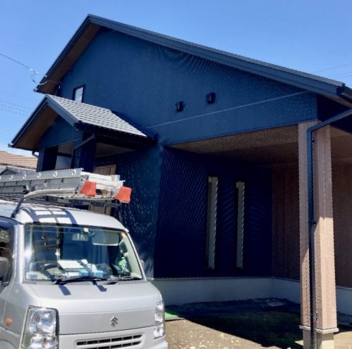 緩やかな勾配の大きな屋根、和モダンを感じさせる、全面黒ガルバ風外壁のとてもステキなお宅です。