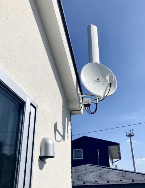 片流れ屋根の低い位置の破風板にサイドベースを取り付け、アンテナマストを立ち上げてユニコーンアンテナ設置を行いました。ユニコーンアンテナの下にはBSアンテナ取り付けを行いました。こちらはパンチングメタル仕様で強風対策に優れた最新の高性能モデルです。丸い面に開けられたたくさんの穴が風の力を逃がしますので、風速70m/秒の風にも耐えられます。強風によりアンテナが回転しないよう、金具も改良されています。