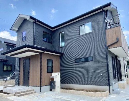 彫りの深いブラックのストーン調サイディングがクールモダンな印象を与えます。現代的で洗練された、存在感のあるお家です。