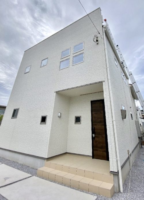 真っ白いスクエアなフォルムに都会的な雰囲気が漂うシンプルモダンなお家です。つるんとした壁面に木調のこげ茶色のドアがマッチしています。