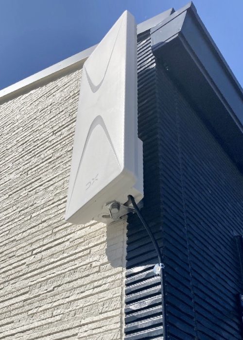 一方、BSアンテナはお家の裏側に取り付けます。壁面にサイドベースを取り付けてBSアンテナ設置を行い、南南西上空に浮かぶ衛星に向けました。こちらのアンテナもビス打ちをして取り付け、ビス穴には防水・防錆対策としてしっかりコーキング処理を行いました。