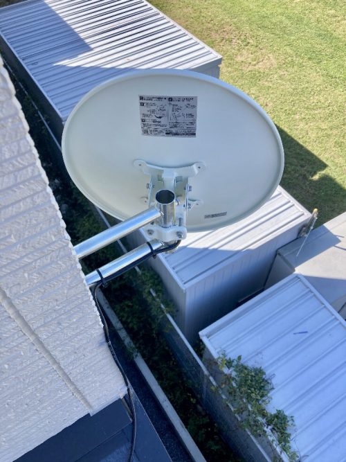 お客さまのご要望はデザインアンテナ設置とBSアンテナ取付けです。お家の周囲をチェックさせていただいたときに思ったのですが、BSアンテナの電波方向が隣のお家の方向でしたので、越境してしまわないかということでした。