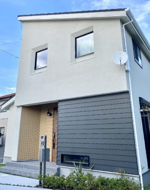 きれいな薄茶色の塗り壁にベージュと黒の木目調サイディングがマッチしています。正方形の窓も斬新で、スタイリッシュでモダンなお家です。
