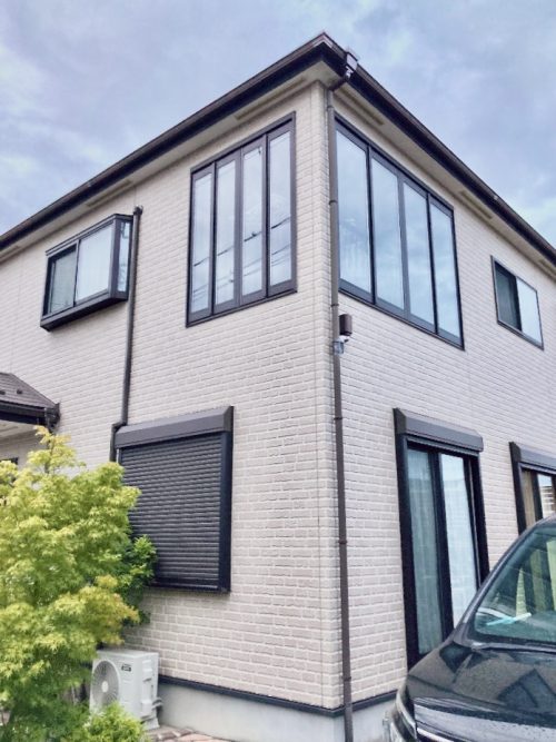 築8年とのことですが新築同様にきれいなお家です。しっとりとした落ち着きを感じさせるクリーム色の石積み調の壁面に、黒の窓枠や雨どいがアクセントになっていて、とてもお洒落です。