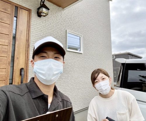 工事後にお客さま写真の撮影をお願いしましたところ、奥さまが快く応じてくださいました。お子さまの面倒を見ながらご協力してくださり、ありがとうございます。ステキなお家の玄関前で、私も一緒に撮らせていただきました。