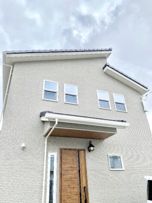 グレイのレンガ調外壁に自然木のドアがマッチしているステキなお家です。