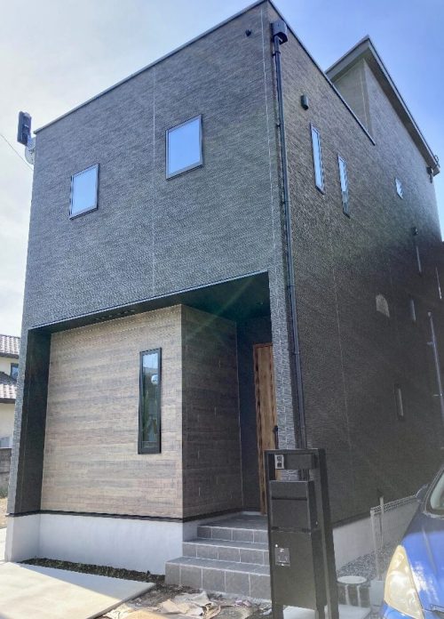 黒壁でスクエアな形状のシンプルモダンなお宅です。味のある渋い木目調のサイディングが組み合わされていて、高級感があります。