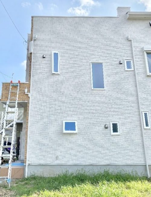 二階の角の壁面に小さな穴を開けてビスを打ち込み、デザインアンテナ設置を行いました。ビス穴には防水・防錆のためにコーキング剤を施しました。