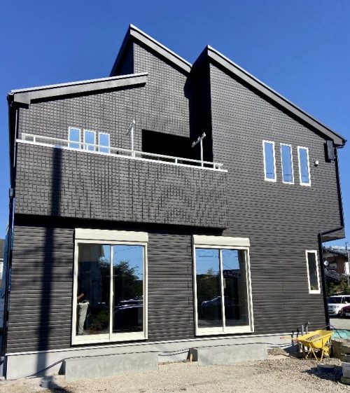 外壁がグレイで統一されたスタイリッシュなお宅です。重なり合った片流れ屋根のフォルムが幾何学的で、現代的な印象を受けます。