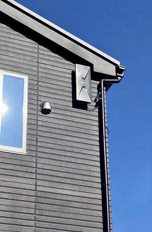 お家のお庭側の片流れ屋根の下側の壁面、破風板のへこんでいる位置にはめ込むようにデザインアンテナ設置を行いました。壁面にビスで取り付け、ビス穴には防水・防錆対策としてしっかりコーキング処理を行いました。