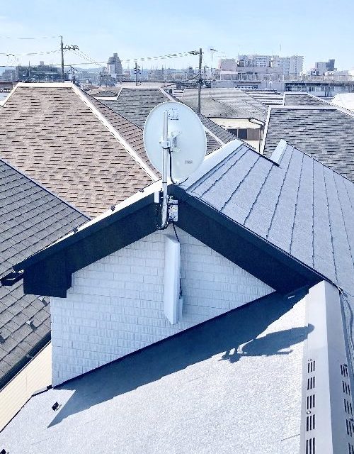 合掌部分にデザインアンテナ設置を、破風にBSアンテナ設置を行いました。