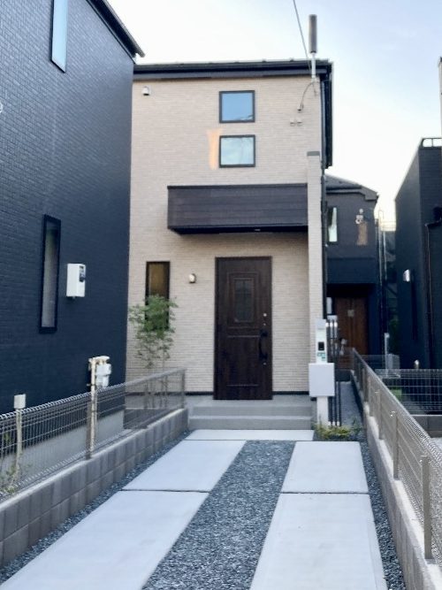 薄茶色のレンガ調外壁で欧風のテイストを感じさせる素敵なお宅です。玄関ドアが木目調のダークブラウンで、アンティークな趣きを感じさせます。玄関上の小屋根にも横板が使われ、レンガにウッディーな質感がとてもよく合っています。
