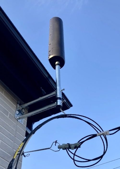 ユニコーンアンテナの利点をお客さまに詳しくご説明した結果、こちらを取り付けることになりました。お家の正面、玄関上の壁面にビス打ちをしてサイドベースを取り付け、アンテナマストを立ち上げます。マストは32Φ(ファイ)の太いマストを使ってしっかり固定しています。こちらにはめ込むようにユニコーンアンテナ設置を行いました。ビス穴には防水・防錆対策としてコーキング処理を施しました。