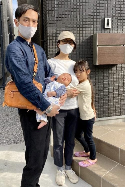 工事後にお客さま写真の撮影をお願いしましたところ、快くOKしてくださいました。理知的な旦那さまとお優しい奥さま、それに可愛いふたりのお子さまたちです。みなさまが揃ってステキなお家の前に立ってくださいました。お姉ちゃん、ちょっとテレてしまってますね。優しいお母さまに甘えられて、それがまた微笑ましいです。