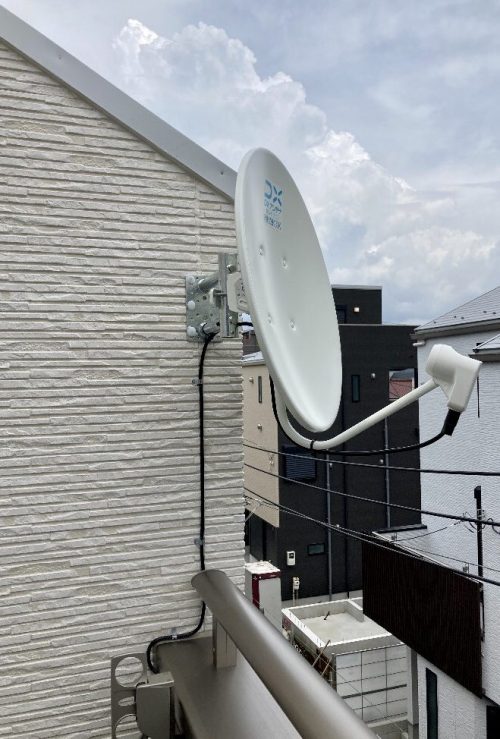 BSアンテナはお隣のベランダに向ける形になりますが、お隣がとても近く、物干しに洗濯物がかけられると電波障害になる可能性があります。その点を加味して、かぶらないように少し離して、ベランダ壁面にBSアンテナ取付を行いました。