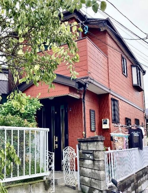 築22年とのことですが、赤い外壁の可愛らしいお家です。張り出し窓や装飾的な白いアイアンの門もステキです。