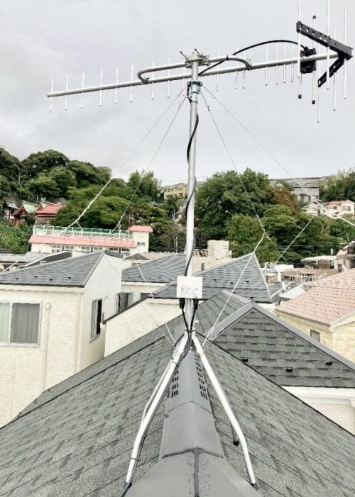 その旨お客さまにお伝えし、八木アンテナ設置でご了解を得ましたので工事に取りかかります。屋根上に屋根馬を取り付けてアンテナマストを立てます。屋根の四隅に支線を張ってアンカーでしっかり留め、アンテナマストに八木アンテナ設置を行いました。みなとみらい局からの電波は垂直偏波ですので、アンテナ素子はタテに向けました。