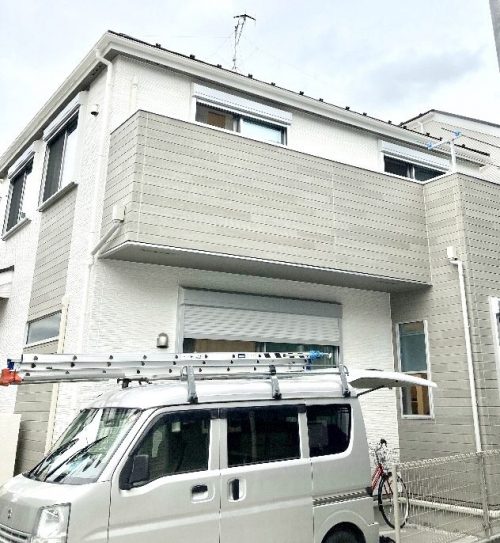 きれいなアイボリーにグレイの横板調サイディングが配された品の良いお家です。