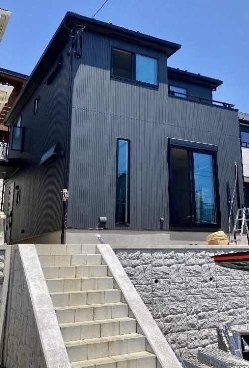 マットな黒い壁面に覆われたクールモダンなお宅です。アプローチの白い階段が美しく、黒い外壁と鮮やかなコントラストを描いています。