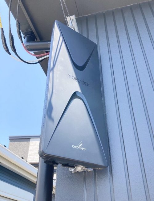 お家の前面の二階壁面、引き込み線のすぐ下にデザインアンテナ設置工事を行いました。ビスでしっかり取り付けて、ビス穴には防水防錆のためにコーキング剤を施しました。ブースター用の電源はユニットバスの天井裏の点検口に設えられていましたので、そちらからブースターへの電気供給を行いました。