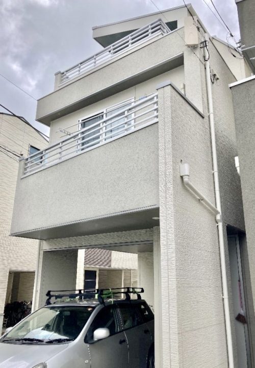 築3年とのことですが、新築同様にきれいなお家です。スモーキーなアイボリーと淡いグレイの外壁の、スマートで都会的な印象の三階建てのお宅です。
