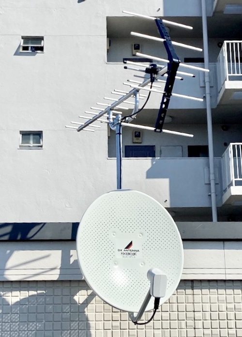 事前にお客さまから「裏手に高いマンションが建っていて、そちらからビル風っぽい風が吹いてくるので、風に強いタイプのBSアンテナを付けたいです」とのご要望をいただいておりました。