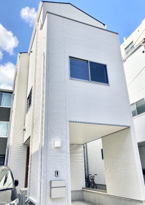 スマートに縦に伸びた、真っ白な美しいお家です。無機的ともいえるほどシンプルで、清潔感があります。