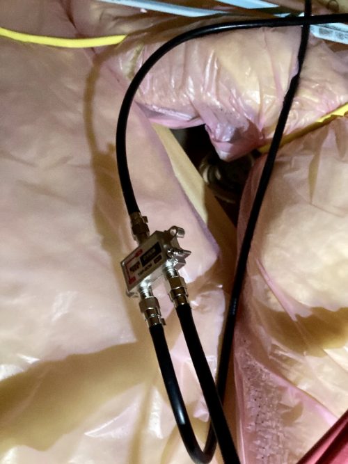 形状的に八木アンテナ設置が難しかったので、屋根材にデザインアンテナ取付けを行うことにしました。それにプラスして屋根裏で二分配工事を行いました。ブースター電源は一階メディアボックスから取りました。