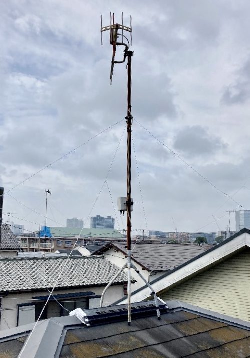 まず屋根上に設置されているUHFアンテナ撤去を行います。次に屋根馬を取り付け、アンテナマストを立ち上げて、高性能パラスタックアンテナ設置を行いました。電波は平塚局から取りますので垂直偏波になります。従ってパラスタックアンテナの素子もタテに向けました。