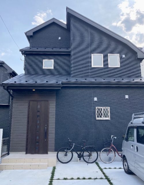 クールでシャープな印象のカッコいいお宅です。全体は黒でまとめられ、ダークブラウンの木目調サイディングやウッディーなドアが配されて、暖かみを添えています。