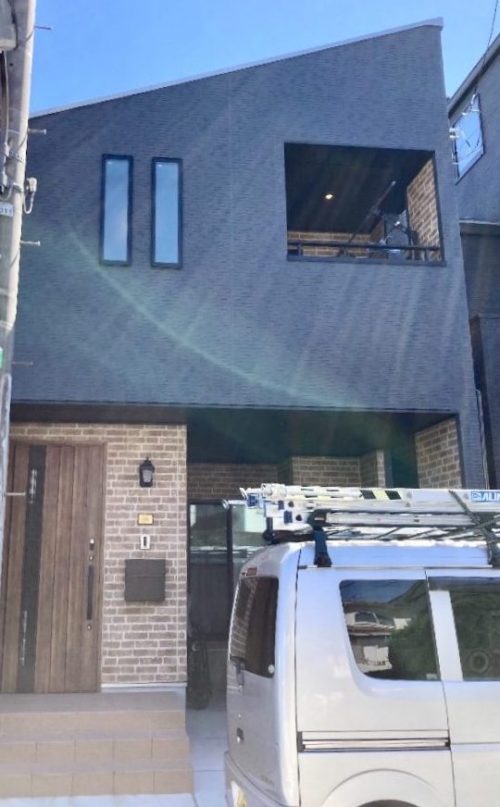 ブラックをベースに、玄関まわりとベランダにはレンガが使われているステキなお宅です。ウッディなドアで暖かみがあり、片流れ屋根もオシャレです。