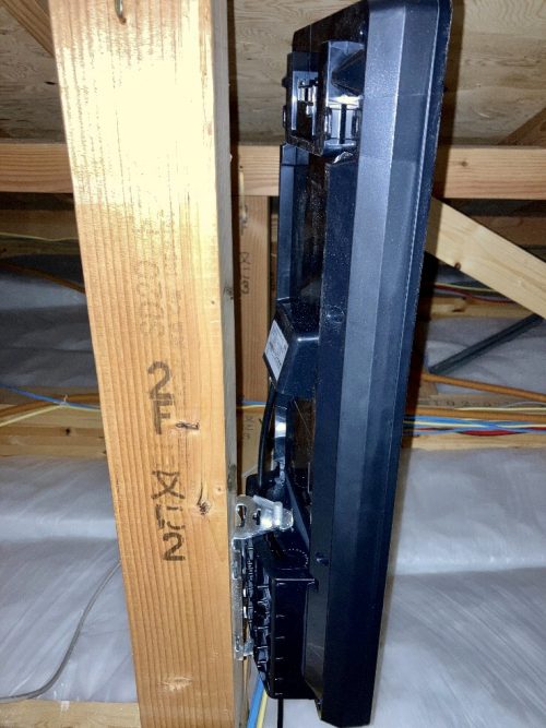 工事に取りかかります。断熱材の施された屋根裏に器材を運び込み、屋根材にビスを打ち込んでデザインアンテナ設置を行いました。アンテナをブースターに接続して電波レベルを上げ、さらにブースターと二階メディアボックスに備えつけられている分配器を接続します。ブースター用の電源は二階メディアボックスから取りました。