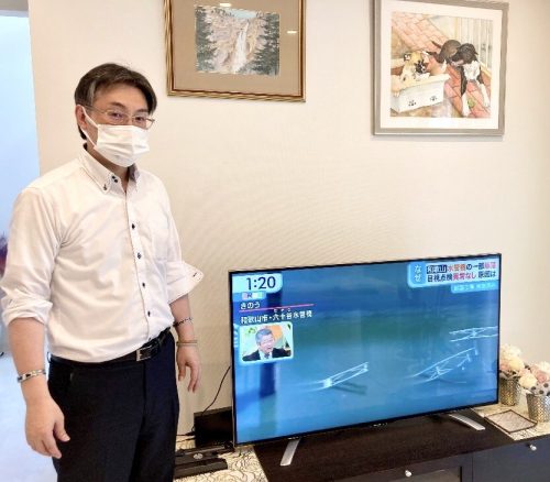 工事後にお客さま写真の撮影をお願いしましたところ快く応じてくださいました。きれいに映るテレビの前でパチリ! 知的な雰囲気を漂わせたダンディなお客さまです。