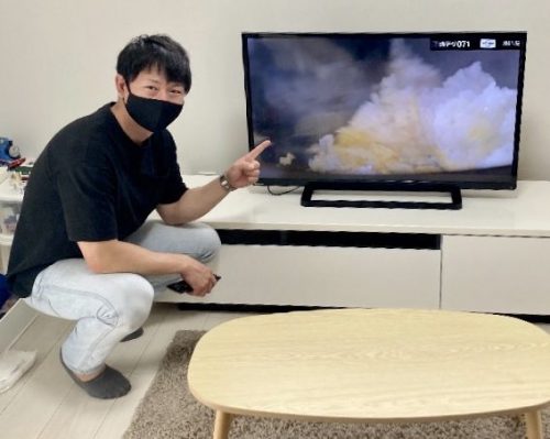 工事後にお客さま写真の撮影をお願いしましたところ、快くオーケーしてくださいました。キレイに映るテレビの前でパチリ。玄関口に仲の良さそうな夫婦写真がありました。カッコいいイケメンさんにキレイな奥さまです。