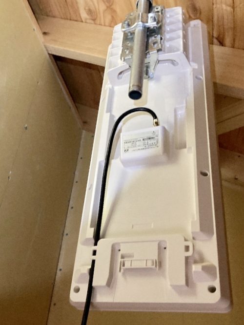 注意して器材を屋根裏に運び入れ、サイドベースを天井板に打ち付けます。そこにはめ込む形でデザインアンテナ設置を行いました。ブースター電源はこちらにありましたので、こちらでブースターに繋ぎました。