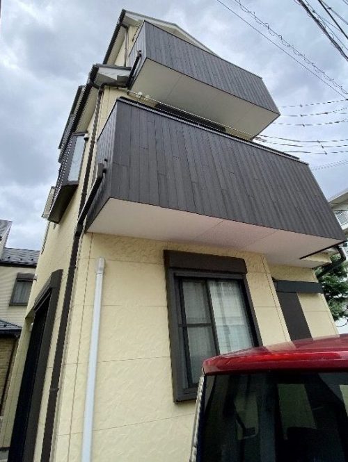 スマートな三階建てのお洒落なお宅です。クリーム色の外壁に焦げ茶色のウッディなベランダや窓枠がアクセントになっています。