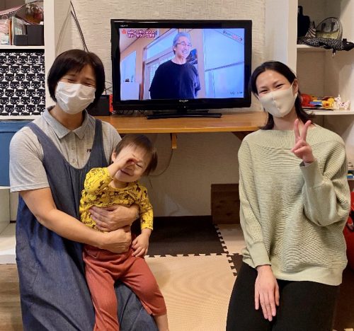 工事後にお客さま写真の撮影をお願いしましたところ快くオーケーしてくださいました。奥さまとお母さまと可愛いお子さまが、キレイに映っているテレビの前でパチリ!