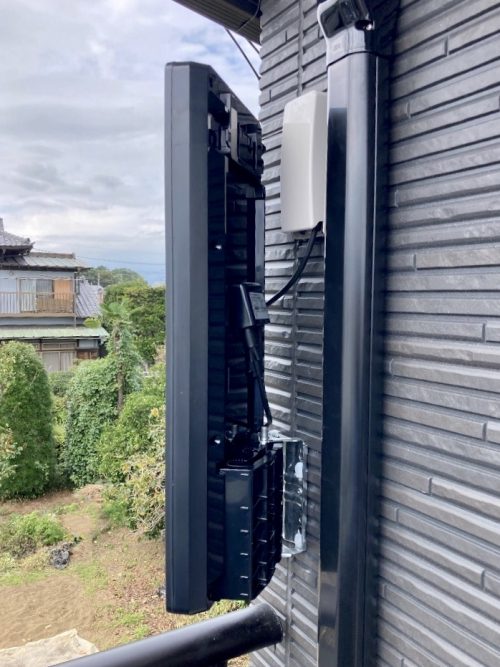 こちらは平塚局から電波を取ります。二階ベランダ壁面の引き込み線と入線口の近い位置に小さな穴を開け、細いビスを打ち込んでデザインアンテナ設置を行いました。黒い壁面に黒でカッコ良く揃えました。ビス穴には防水・防錆対策としてしっかりコーキング処理を行いました。