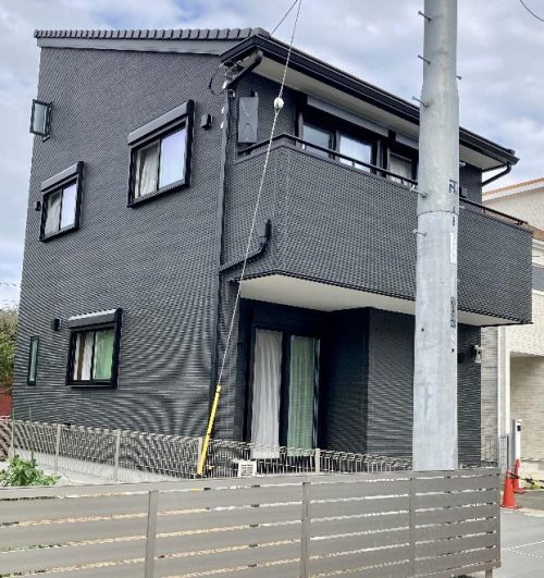外壁がすべて黒一色のカッコいいお家です。よくよく見ると黒いサイディングにこげ茶が組み込まれていて粋です。