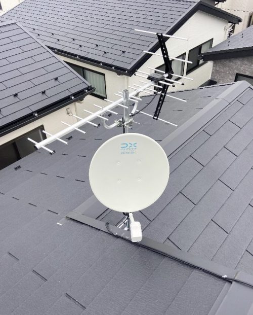 • 段違い屋根の壁面に八木アンテナ設置とBSアンテナ取付工事を行いました。