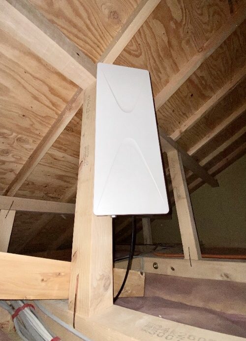 広々とした屋根裏に器材を運び込み、木材にビスを打ち込んで固定し、デザインアンテナ取り付けを行いました。