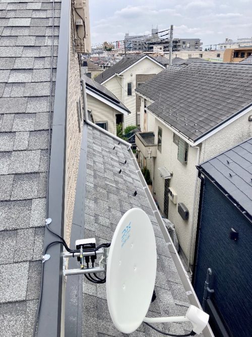 さらにそこから斜めに屋根を下がったところに、ビス打ちをしてサイドベースを取り付け、BSアンテナ設置を行いました。
