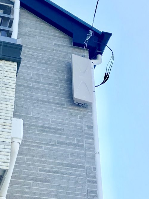 お客さまにアンテナ設置位置について打診し、オーケーをいただきましたので、工事に取りかかります。お家の前面が電波方向になり、引き込み線が来ていましたので、その脇にビス打ちをしてデザインアンテナ取り付けを行いました。
