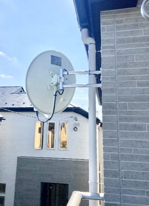 お家の裏手のベランダ脇の壁面にBSアンテナ取付工事を行いました。