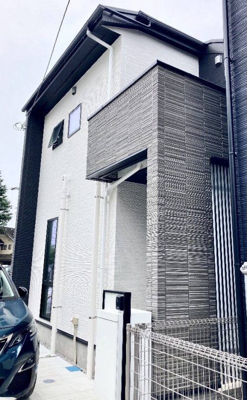 白とグレイと黒が絶妙のバランスで組み合わされたセンスの良いデザイナーズ住宅です。随所に意匠が凝らされていて、オーソドックスでありながらユニークです。