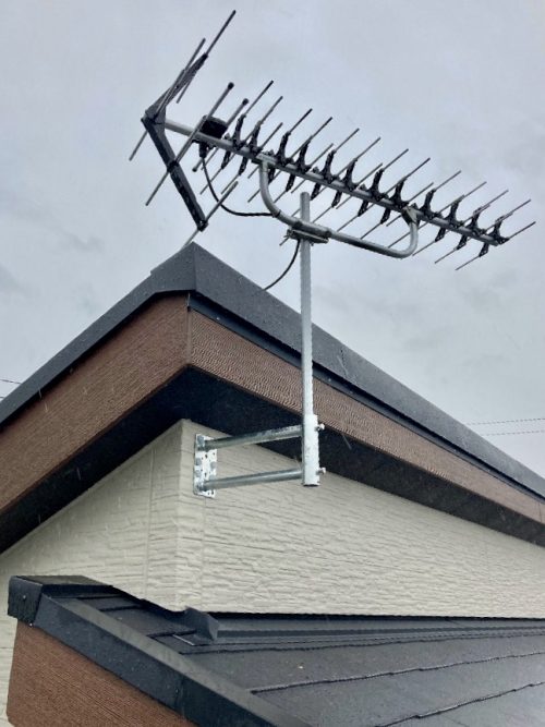 お家の奥側に取り付けましたので、正面からはアンテナは見えません。ビス穴には防水・防錆対策としてコーキング処理を行いました。